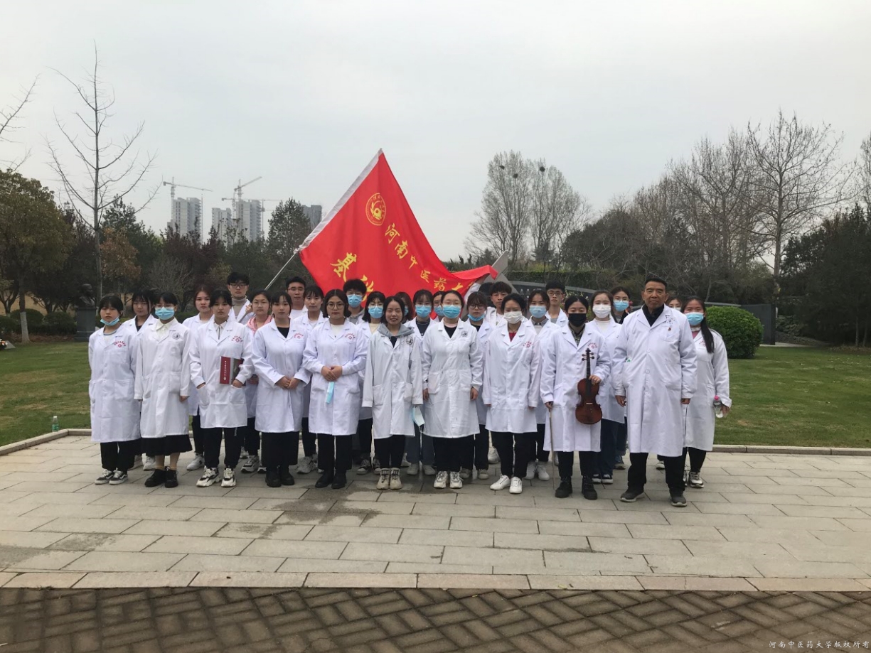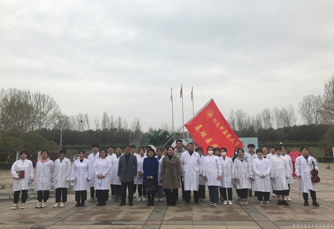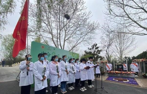 2021年3月26日清明节来临之际,基础医学院师生应郑州市红十字会“生命传承·大爱永续”为主题的清明节缅怀纪念活动邀请,与遗体捐献者家属等社会各界人士一起,缅怀纪念这些令人尊敬的遗体及人体器官捐献者。家属代表及志愿者代表向遗体器官捐献者纪念碑敬献花篮、鲜花,摆放千纸鹤,表达崇敬之情。师生们表演了感人至深的《良师无言》的诗朗诵并进行了医学宣誓。