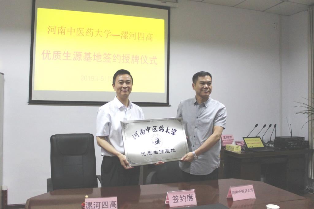 漯河市第四高级中学是河南省示范性普通高中,建校于1949年,历史悠久,文化氛围浓厚,育人硕果累累,把这所学校列为我校“优质生源基地”,将有助于增进两校互助合作,吸纳更多优秀人才投身祖国中医药事业。