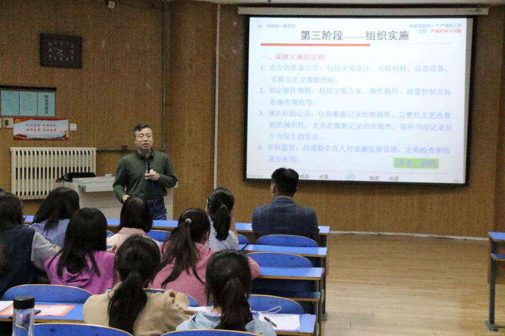 讲座伊始,杨联河教授首先以“什么是科学”这个问题为切入点,引起大家对科研的思考,用其渊博的学术知识从科研选题、研究设计、组织实验、资料整理、数据分析五个方面对科研的一般程序进行了全面阐述。接着,杨教授与同学共同解读了“科学”一词,并就科学与技术的区别进行探讨,杨老师表示科学与技术是不同的概念,但二者之间相辅相成,相互发展,做科研不仅要学习科学的方法,还要学习实现科学的技术,而其中良好科学思维方式就显得格外重要,随后杨教授便以归纳推理和演绎推理为例,向同学们讲解如何进行科学思维方式的培养。本次讲座中杨教授用其从事科研多年的经历和妙语连珠的幽默讲述方式为同学带来了一场别开生面的科研盛宴,赢得了阵阵掌声。在接下来的互动交流环节中,同学们都积极提问,现场氛围十分热烈。最后,闫辉老师为本次活动作总结讲话,他首先对在座学生积极学习的精神表示赞扬,并鼓励大家不仅要学好专业知识,更要树立科学创新意识,培养科学创新能力,争做更能担当民族复兴大任的新时代青年。