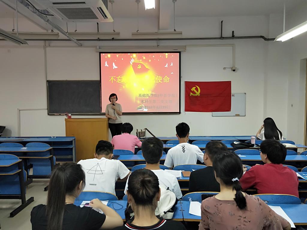 在七一建党节来临之际,为深入学习贯彻习近平新时代中国特色社会主义思想和党的十九大精神,庆祝建党97周年,6月29日下午基础医学院(仲景学院)本科生第二党支部在A441举办“不忘初心、牢记使命”主题党日活动。党支部书记李倩老师及全体学生党员到场参加。