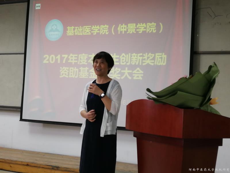 会上,李倩老师宣读基础医学院(仲景学院)2017-2018年本科生创新奖励奖金评定结果。朱艳琴老师和禄保平书记共同为为获奖的优秀学生代表颁奖。颁奖后,优秀学生代表黄静波同学发言,他首先表达了对大学生创新奖励基金的资助者——朱艳琴老师以及辛勤指导学生科研项目的全体指导老师表示感谢,并结合自身参赛经历作出经验分享。紧接着,朱艳琴教授讲话,她针对本科生科研项目的申报,强调提早进入实验室做科研的必要性,并对我院师生的科研发展给予厚望,指出要培养兴趣、创新思维,学会团队合作。最后,禄保平书记对此次大会作总结讲话,他代表全院师生向朱艳琴教授对我院创新奖励金的资助表示由衷的感谢,向受到表彰的优秀学生表示祝贺。最后,禄书记以海子的诗句“以梦为马,以汗为泉,不忘初心,不负韶华”鼓励同学们积极投入到科研创新中,希望同学们以严谨求实的科研精神,培养勇于创新、敢于挑战的科学精神和坚韧不拔、锐意进取的意志品格。