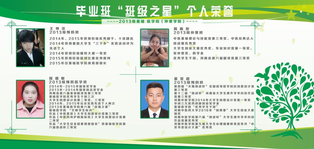 4名毕业生班级之星中,2013级预防医学本科班3名,2013级仲景学术传承班1名。他们分别是:荣获国家奖学金、国家励志奖学金、河南省第八届英语翻译竞赛三等奖、优秀学生干部、优秀团员、军训先进个人、大学生创意设计竞赛三等奖、大学生创意设计竞赛二等奖、社会实践先进个人、基础医学院(仲景学院)第八届“自强之星”、基础医学院(仲景学院)文明学生标兵、第六届挑战杯三等奖等荣誉的2013级预防班程德敏同学;荣获第四届“天堰挑战杯”全国高等医学院校大学生中医药创意设计竞赛三等奖、第十二届“挑战杯”河南省大学生课外学术科技作品竞赛三等奖、2014年大学生创意设计竞赛一等奖、军训先进个人、华润三九医药创新创业奖学金、优秀团员、优秀学生干部、2016年“创青春”大学生创业大赛铜奖、第六届“挑战杯”大学生课外学术科技作品竞赛优秀奖等荣誉的2013级预防班崔亚超同学;荣获校级优秀团干、十佳团员、暑假大学生“三下乡”实践活动先进个人、校级模特大赛一等奖等荣誉的2013级预防班王帅宗同学;荣获校中医基础理论与技能竞赛三等奖、中医经典达人挑战赛优秀奖、大学生创业大赛优秀奖、张仲景奖、助学金、优秀学生干部、河南省第八届翻译竞赛三等奖等荣誉的2013级仲景班周雨彤同学。