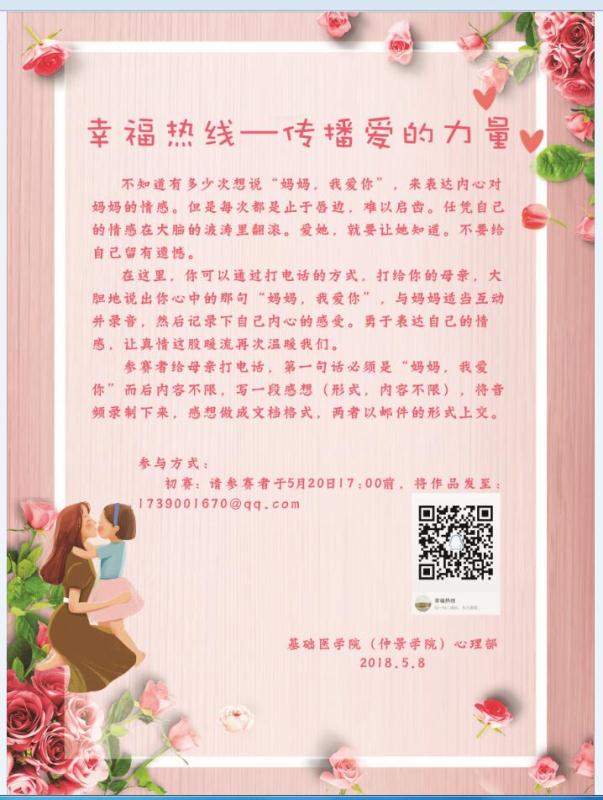 为深入开展大学生心理健康教育,展现大学生精神风采,弘扬感恩孝道的传统美德,基础医学院(仲景学院)于2018年5月13日举办以“妈妈,我爱你”为主题的“幸福热线”校园大赛。