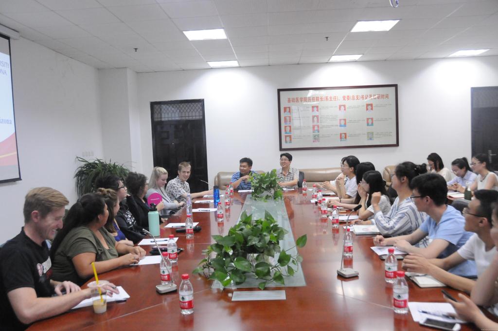 交流会伊始,徐书记对亚利桑那大学同学的到来表示了热烈欢迎,热心为其讲解了基础医学院(仲景学院)概况和人才培养情况,并鼓励中美青年大学生积极交流。随后,我院预防医学专业学生就中美之间大学生活差异、专业课的区别、实习和毕业后的就业方向等内容与美国学生进行了深入的交流。对我院学生提出的问题,美国同学都给予了热心、真的回答,交流过程中他们对我院同学的英语口语能力表示赞赏。最后,双方又就“如何看待男女比例不平衡”“中美食物之间的差异”等课外话题展开了热烈的讨论,交流持续三小时,双方学生兴致勃勃,意犹未尽。