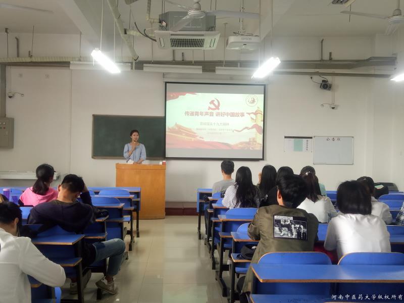 参与本次宣讲的三位优秀党员骨干分别是来自本科生一支部的付蓉,本科生二支部的苗开齐,以及研究生一支部的吴明明同学。在指导老师的细心指导和各位宣讲人的精心准备下,按照计划规定时间,分别到16级预防班、16级仲景班以及17级预防班团支部,为同学们进行思想上的指引与帮助。此次宣讲的主题是:传递青年声音,讲好中国故事。宣讲的内容主要包括三个方面:一是坚定四个自信。二是讲好中国故事。三是成就时代青年。坚定“四个自信”即是坚定道路自信、理论自信、制度自信、文化自信。坚定文化自信,尤其是离我们最近的中国传统文化,告诫青年学生继承发扬好优秀传统文化。讲好中国故事,告诉大家从线上、线下讲好传播好中国好故事,提高甄别判断信息的能力,善于利用网络做好爱国活动。成就时代青年,从对时代青年的要求谈起,结合习近平总书记对青年的希望,给在场学生以思想上的启发与指引,并以梁启超先生的少年中国说为寄语,令人热情澎湃,倍感振奋与鼓舞。
