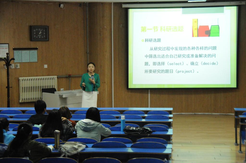 首先,王老师从“科研选题”、“科研设计”、“组织实施”、“资料处理”、“分析总结”五个方面向同学们讲述医学科研过程。王老师指出在做科研项目前应先确定选题。要遵循科学性和创造性原则,以客观事实为依据,选取新颖、首创、国内外尚无人研究的课题。随后,王老师通过实例分析,强调了文献检索在医学科研过程中的重要性,在阅读文献时不仅要理解内容,还要了解文献所研究的科学问题、运用的研究手段、创新思想等,做到融会贯通,获取更多有效信息。最后,王老师鼓励同学们要敢于创新、勇于实践,不断努力攀登科学高峰。