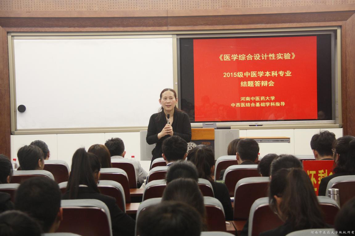 答辩结束后,中西医结合基础学科主任杨丽萍教授对答辩情况进行了总结。她肯定了《医学综合设计性实验》课程项目答辩过程中同学们的表现,鼓励同学们进行更多有意义的医学科研项目探索,提高科研综合素养,以推动中医药科研事业的发展;同时也激励带教老师再接再厉,全面调动学生科研创新的积极性和科研项目的执行能力,争取设立更多有意义的科研项目,同时要推动项目成果落地生根,转化为科研论文、发明专利等实效内容,争取在各级各类创新创业项目申报中取得更好的成绩。