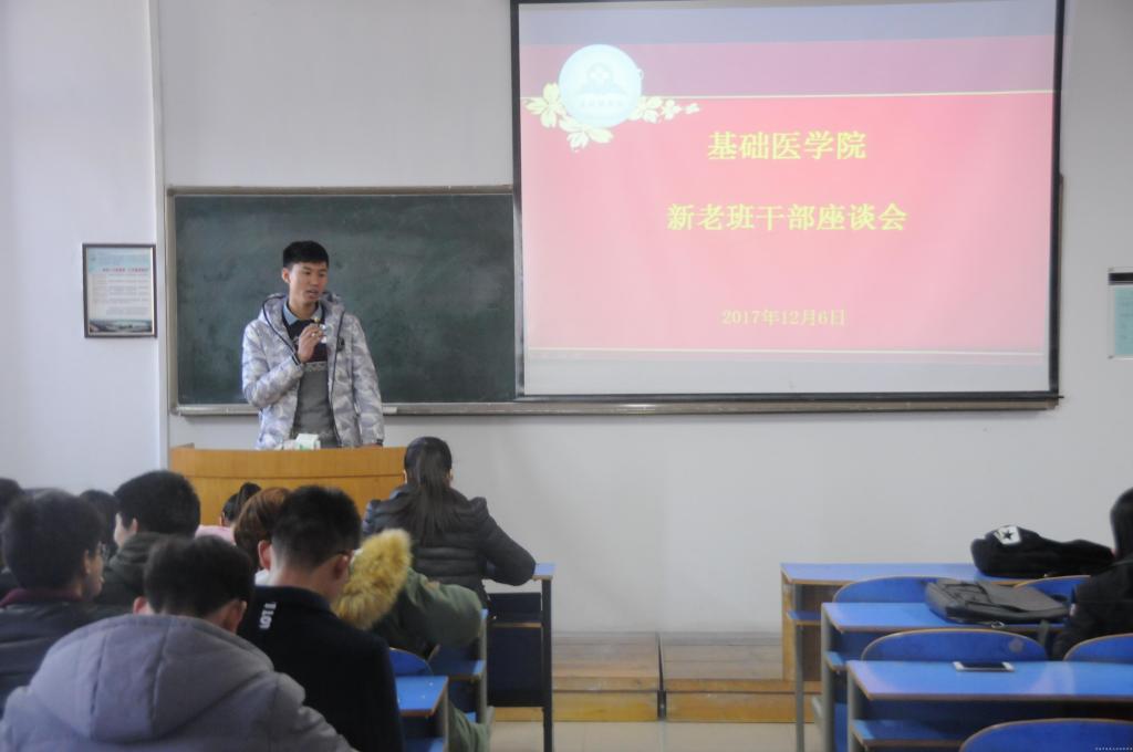 为使2017级新生班干部明确定位及目标,不断提升自身能力及日常的工作效率,更好的开展班级建设,促进新生各项工作的开展,12月6日基础医学院在A414教室开展新老生班干部交流座谈会,交流会有新生辅导员刘颖老师主持。