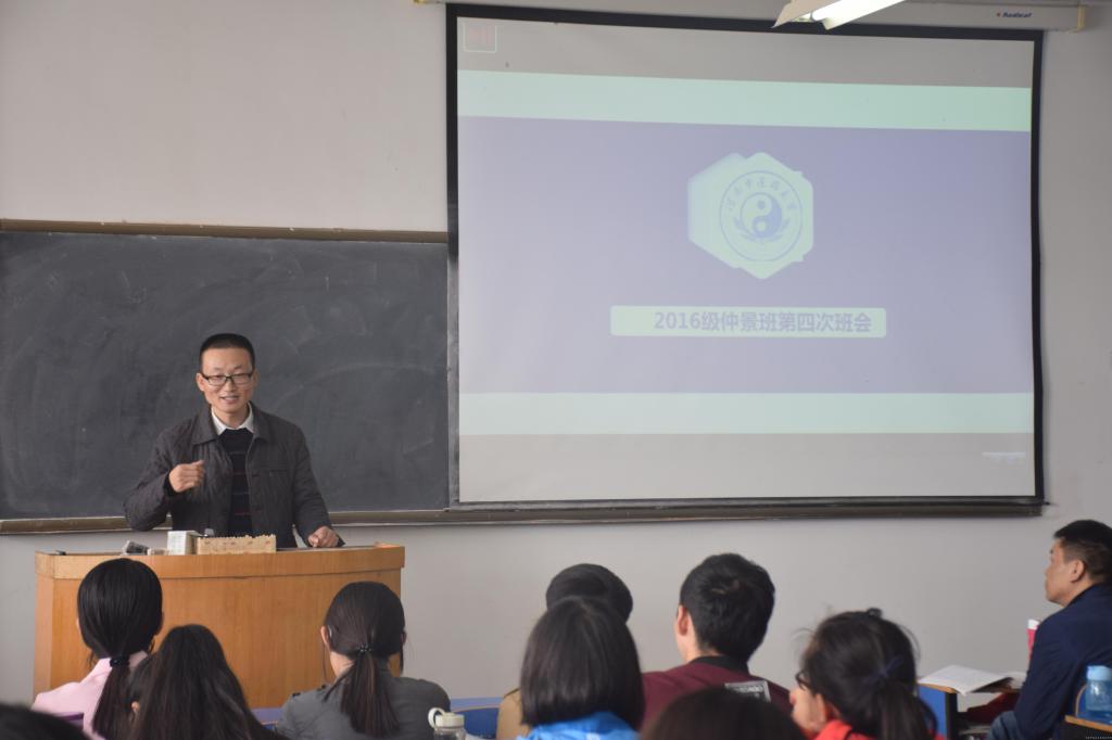 2016级仲景班班主任段晓博士,出身于中医世家,对中医理论及中医临床均有很深的造诣,刚一见面,同学们就被段老师的博学所深深吸引,段老师在分享他中医求学问、做临床道路上经历的同时,紧紧结合仲景班人才培养总体思路及培养目标向班级同学提出了要求,希望同学们牢固学习和树立中医思维,重视经典、打牢基础;积极向经典学、向名师学、向临床学,力争成为信念执着、专业知识扎实、综合素质优秀的中医传承人才;希望班级同学积极营造一个好的学习氛围,在中医学习之路上,在老师的引领下,共同学习、共同进步。