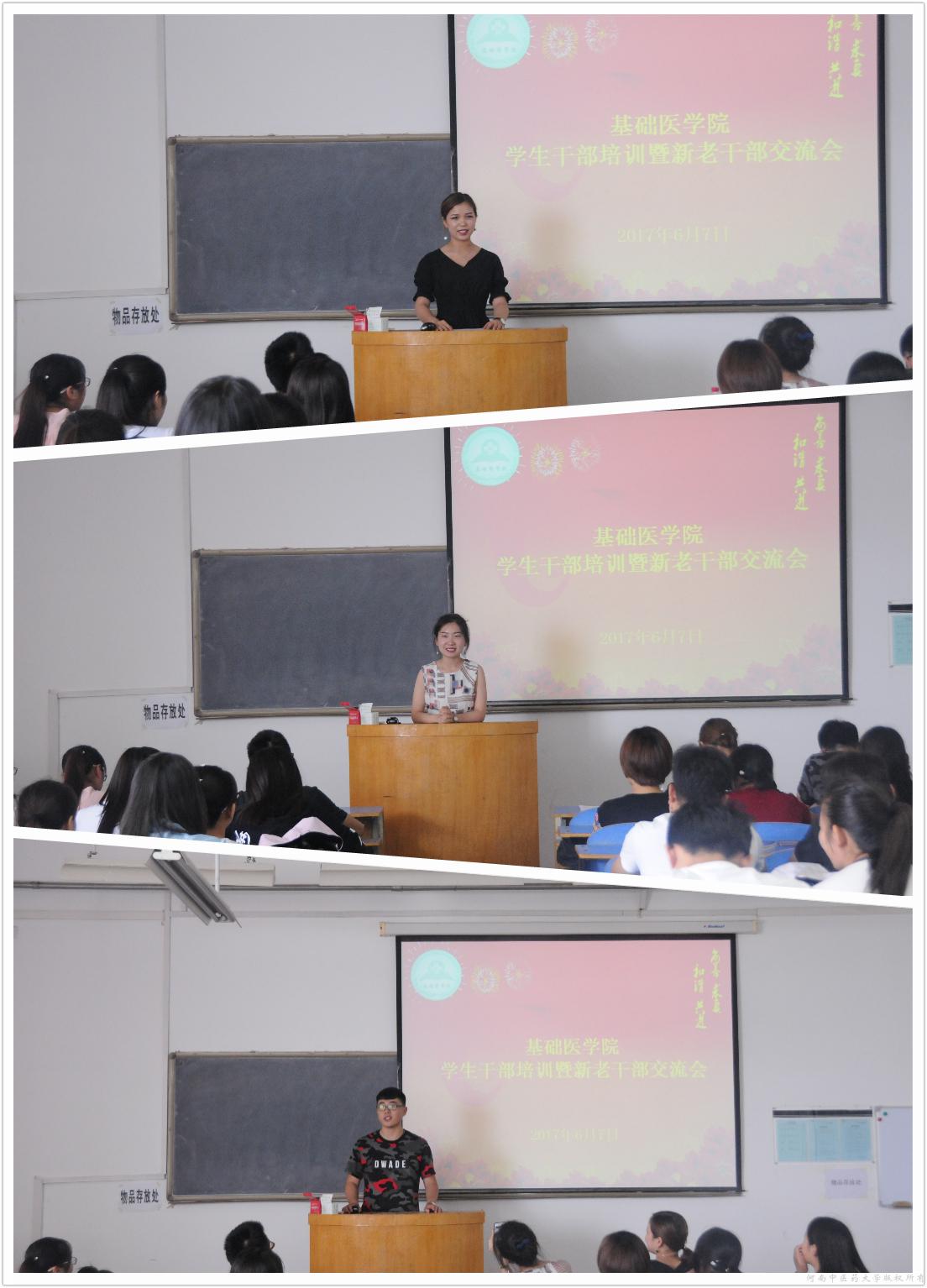 6月7日中午,基础医学院在A441教室开展第十一届学生会干部培训暨新老干部交流会。本次培训特邀我院第八届学生会主席周亚飞、副主席白强民、第九届学生会主席付蓉为第十一届学生会干部交流经验。基础医学院学生会全体成员参加了此次培训。