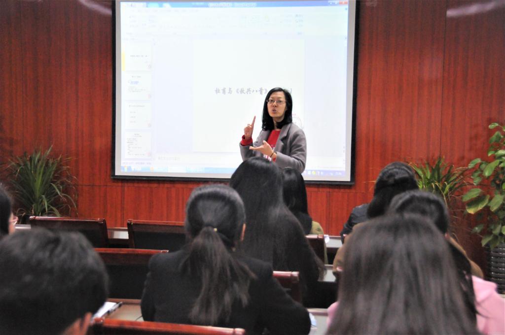 讲座伊始,姜老师首先就诗词大会的概念进行概述,以诗词大会的答题类型为基础,详细讲解各种题型的答辩技巧。随后,姜老师将重点放在诗词的记忆上,以“杜诗”为例,专注于诗词意境分析和记忆技巧,帮助同学们在深入理解诗词创作背景的基础上加深记忆。姜老师节奏紧凑、层层递进的讲课方式受到同学们的喜爱,学生们认真记录要点并积极参与互动。最后,同学们根据课程内容中的疑惑提出问题,姜老师耐心解答,并分享自己的一些心得与体会,她建议同学们在学习古典文学的过程中注意建立整体观念,触类旁通,深入了解诗词文化。