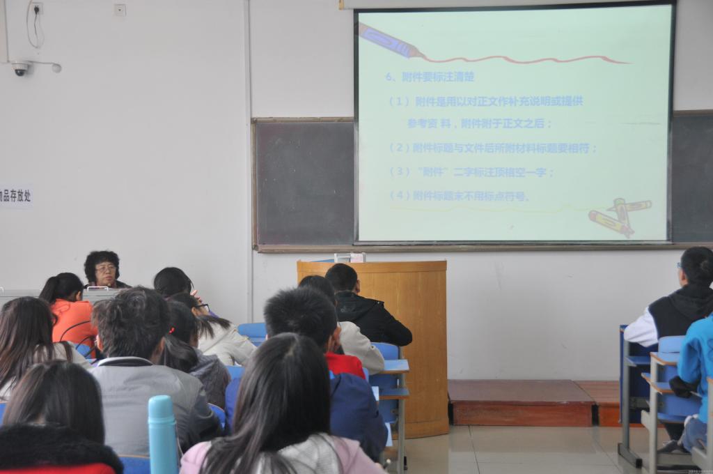 张书记从“公文写作基础知识”、“学校机关常用公文”、“新闻写作”三方面展开阐述。在讲述基础知识时,她对于公文写作的基本要求谈到以下几点:一是表述准确严密、二是文字精确简练、三是修改完善认真、四是全面准确反映客观实际情况。讲座中,张书记提出一些具体问题如“视察”、“考察”、“检查”三词的应用区分等请同学们的思考。针对学校机关常用文件,如决定、通知、通报、总结等,张书记列出范文,让大家熟悉常用公文文种的书写规范。谈及新闻写作时,张书记深有感触,她结合自己多年工作经验,将新闻的特点概括为快、实、新、短四个字,并着重对“如何写好一篇新闻稿”进行讲解。最后,张书记希望大家在培训结束后,好好消化吸收相关知识,以便用于今后的公文写作实践。张书记全面细致、深入浅出的讲解赢得了在座学生的一致好评,同学们表示受益匪浅。